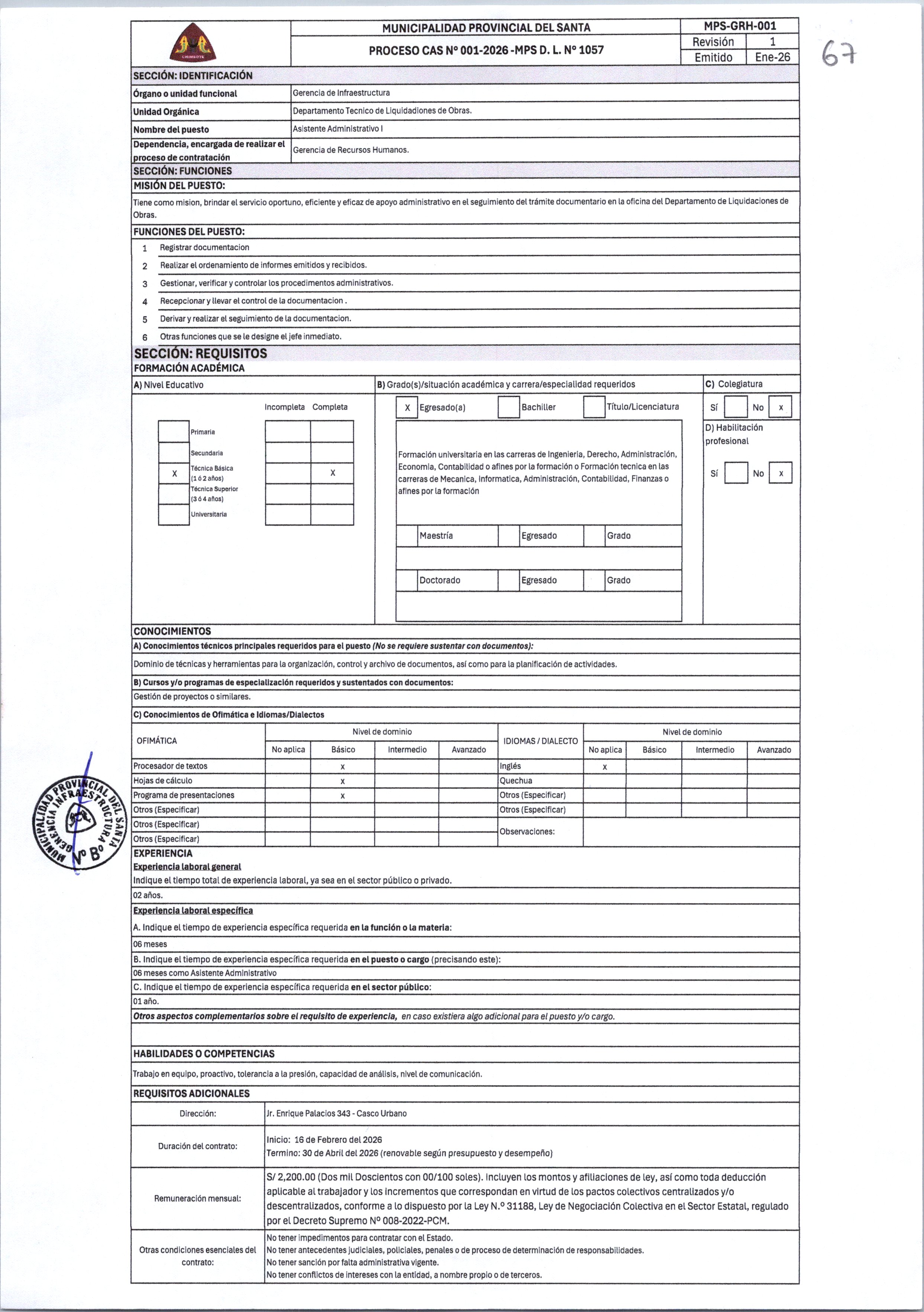 | 67 | PROCESO CAS N° 001-2026-MPS ASISTENTE ADMINISTRATIVO I |