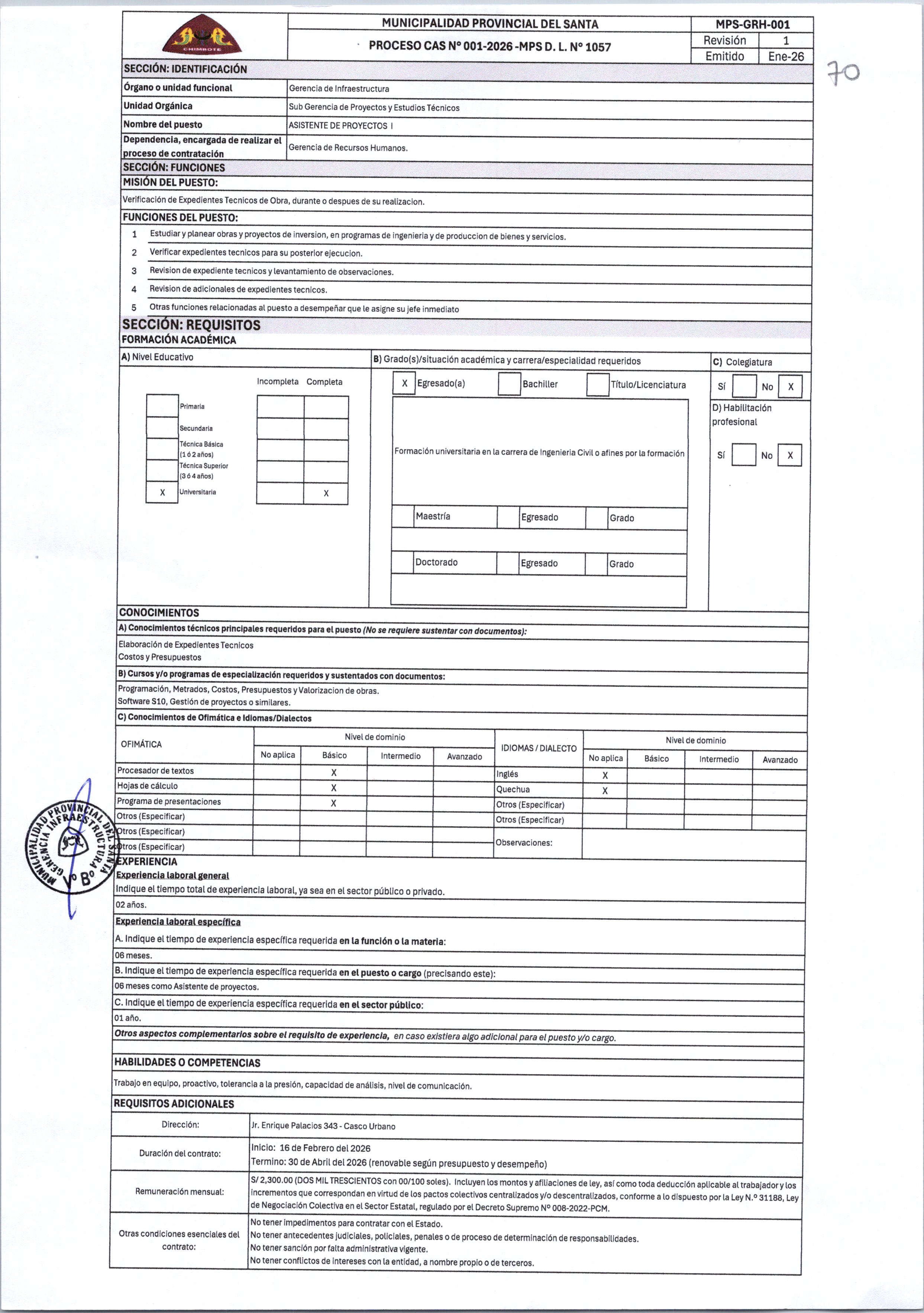 | 70 | PROCESO CAS N° 001-2026-MPS ASISTENTE DE PROYECTOS I |